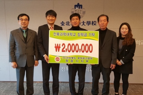 전북과학대학교(총장 황인창)는 지난 7일 전라북도옥외광고협회 정읍시지부(지부장 김광수)로부터 장학기금 200만원을 기탁 받았다.