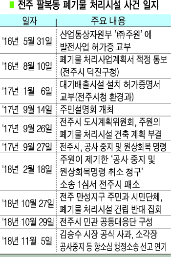 전주시가 해당 업체의 폐기물 처리시설 건립 계획을 알고도 법적 문제가 없다는 판단 아래 사업계획 ‘적정 통보’, ‘허가증명서 교부’ 등 제반 행정절차를 승인했기 때문이다.