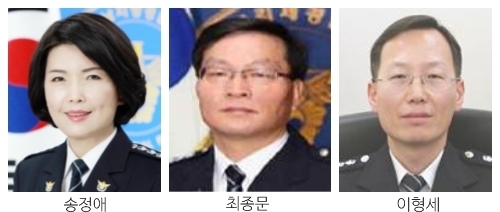 13일 경찰청에 따르면 전북에 연고지를 둔 경무관 승진 내정자는 정읍 출신 송정애(55) 대전청 경무과장, 정읍 출신의 최종문 (51) 서울지방경찰청 인사교육과장, 김제 출신의 이형세(51) 경찰청 수사구조개혁1팀장 등 세 명이다.