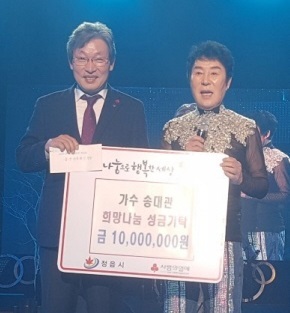 송대관 씨는 “가요계 재기(1988년) 30년이 되는 올해는 저한테 의미 있는 해였고, 오랜 세월 넘치는 사랑을 아낌없이 베풀어주신 고향 분들에게 감사드린다”며 “어렵고 소외된 고향 분들을 위해 조금이나마 도움을 드리고자 성금을 기탁한다”고 밝혔다.