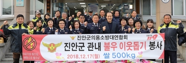 진안군 의용소방대연합회(회장 전해룡, 김경임)가 연말연시를 맞아 지난 17일 어려운 이웃을 위한 사랑의 쌀 나눔 전달식을 가졌다.