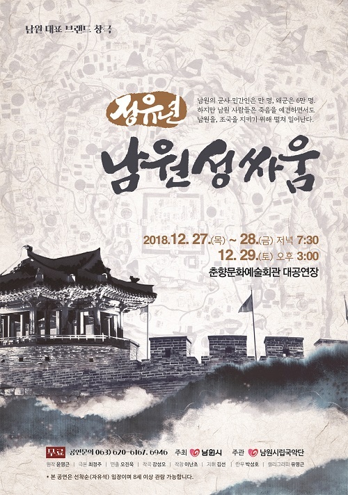 남원시가 주최하고 남원시립국악단이 주관하는 창극 ‘정유년 남원성 싸움’은 원작·구성에 향토소설가 윤영근, 극본 최정주, 연출 오진욱 등 남원 지역에 대해 이해가 높은 연출진이 참여했다.