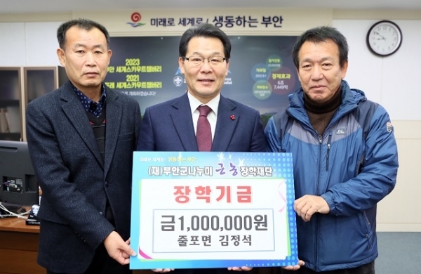 부안군 줄포면 원동마을 김정석 이장은 19일 지역인재육성 및 교육환경 개선을 위한 장학금 100만원을 기탁했다.