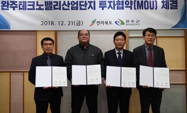 21일 박성일 완주군수와 나석훈 전북도 경제산업국장, 박종업 영산글로넷 대표, 권오석 엘에스엠트론 전주공장장은 완주군청에서 만나 이같은 내용의 ‘완주테크노밸리 일반산업단지 투자협약’을 체결했다.