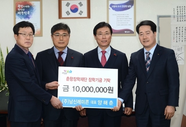 ㈜남신레미콘(대표 양해춘)은 지역 인재양성을 위해 춘향장학재단에 26일 장학기금 1000만 원을 기탁했다.