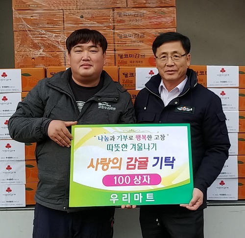고창군 고창읍 우리마트(대표 이홍기)가 관내 경로당 및 저소득층에 전해달라며 감귤(7.5㎏) 100상자를 고창읍에 기탁했다. 우리마트는 지역사회의 어려운 이웃들을 위해 수년째 이웃돕기 물품을 기탁해 오고 있다.