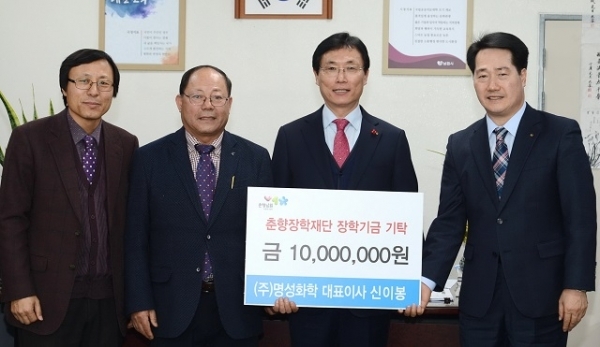 ㈜명성화학(대표 신이봉)이 지난 26일 춘향장학재단에 장학기금 1000만 원을 기탁했다.
