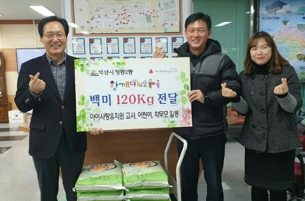 익산시 영등2동 아이사랑유치원(원장 최예천)은 어려운 이웃을 돕는데 사용해 달라며 백미 120Kg을 영등2동 행정복지센터(동장 박기성)에 기탁했다.