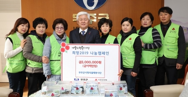 지난 28일 무주군 사랑의 열매 봉사단원(단장 권정심)들이 성금 200만 원을, 무주와인생산자협회(회장 이재국)에서 200만 원, (유)이룸건설(대표 서종운)에서 100만 원, ㈜이룸(대표 서정림)에서 100만 원을 각각 기탁했다.
