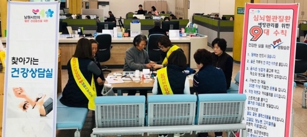 남원시는 올해 지역주민의 심뇌혈관질환 예방관리를 위해 각종 행사, 관내 업체·기관 등으로 찾아가는 건강상담실을 운영하고 4000여 명의 참여자 중 177명의 질환 의심자를 발견했다. 또한 23개 읍·면·동에서 튼튼혈관 고당교실을 운영해 공중보건의사와 전문인력의 다양한 교육을 통해 고혈압, 당뇨병 환자 및 고위험군의 적절한 관리와 심뇌혈관질환의 건강지표 개선에 나섰다.
