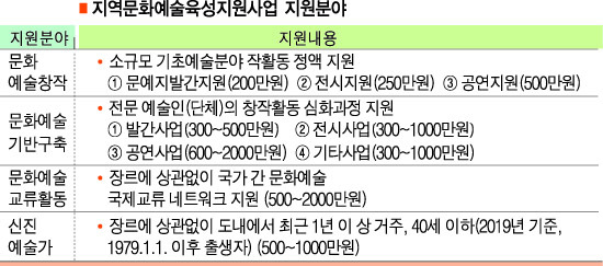 지원분야는 ‘문화예술창작’, ‘문화예술 기반구축’, ‘문화예술 교류활동’, ‘신진예술가’ 등 4개로 지난해와 같지만, 문화예술창작 분야는 항목별 정액 지원방식으로 개편됐다. 지난해 문화예술창작 분야는 10개 장르로 나눠 지원 대상과 금액을 결정했지만, 올해는 문예지 발간 200만 원, 전시 250만 원, 공연 500만 원 등 3개 항목으로 나눠 정액 지원한다는 것.
