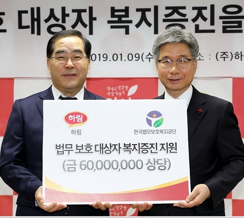 ㈜하림은 협약을 통해 올해부터 오는 2020년까지 2년간 한국법무보호복지공단 24개 지부에 5만4000수(시가 6000만원 상당)의 닭고기 제품을 지원키로 했다.