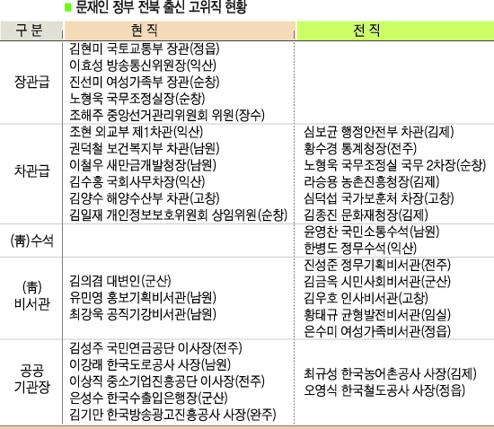 지난해 12월 심보균 행정안전부 차관(김제), 심덕섭 국가보훈처 차장(고창), 최수규 중소벤처기업부 차관(전주), 라승용 농촌진흥청장(김제) 등 4명이 자리에서 물러났다. 다만 김일재 전 행정안전부 정부혁신조직실장만이 차관급인 개인정보보호위원회 상임위원으로 승진했다.