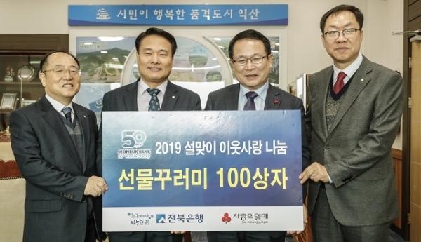 전북은행(은행장 임용택)은 22일 정헌율 익산시장을 방문해 어려운 이웃들에게 전달해 달라며 설맞이 생필품 선물꾸러미 100박스(시가 250만원 상당)를 기탁했다.