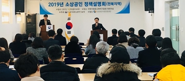 전북지방중소벤처기업청(청장 김광재)은 지난 25일 오후 중기청 대회의실에서 전북도와 14개 시·군 담당공무원, 소상공인 협회와 단체 관계자등 70여 명이 참석한 가운데 ‘2019년도 소상공인 정책설명회’를 개최했다.