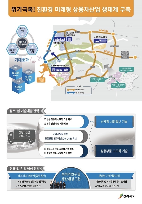 전북도에 따르면 미래상용차 산업생태계 구축사업에는 올해부터 2023년까지 5년 간 1930억 원이 투입된다. 정부와 도는 ‘점프-업 융복합 기술개발’과 시험·실증 연구기반 구축, 부품생산 집적지 육성 및 기업지원을 통해 전북을 미래상용차 전진기지로 만든다는 계획이다.