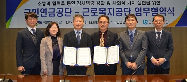 국민연금공단과 근로복지공단은 12일 전주시 덕진구 공단본부에서 이춘구 상임감사와 근로복지공단 김광식 감사, 양측 관계자들이 참석한 가운데 양측의 감사역량 강화와 경영혁신가치를 실현하기 위한 업무협약을 체결했다.
