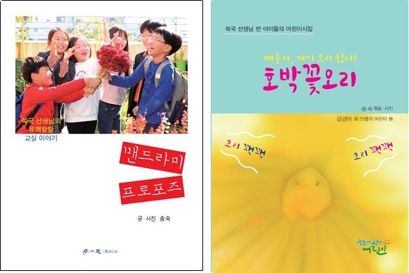 군산푸른솔초등학교 3학년 5반 아이들이 송숙 교사와 함께 교실 옆 화단을 가꾸며 1년 동안 모은 사진과 글을 엮은 어린이 시집 <호박꽃오리> 와 교실이야기를 담은 <맨드라미 프로포즈> (도서출판 학이사)를 출간했다.