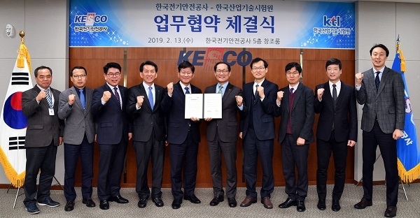 한국전기안전공사는 13일 전북혁신도시 본사에서 조성완 사장과 한국산업기술시업원 정동희 원장, 양측 관계자들이 참석한 가운데 ESS(에너지저장장치) 화재사고 공동연구와 시험인증 기술력 강화를 위한 업무 협약을 맺었다.
