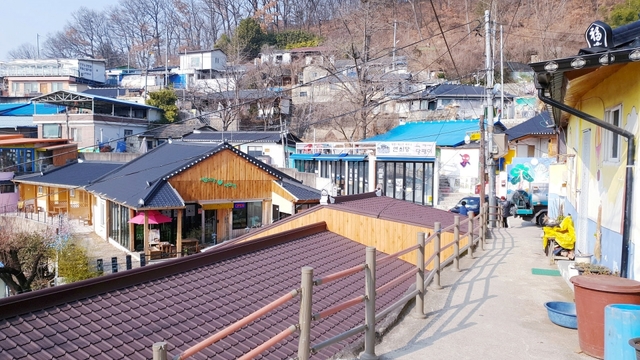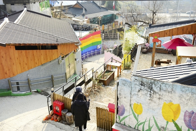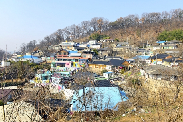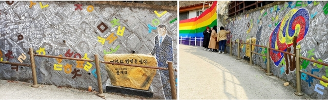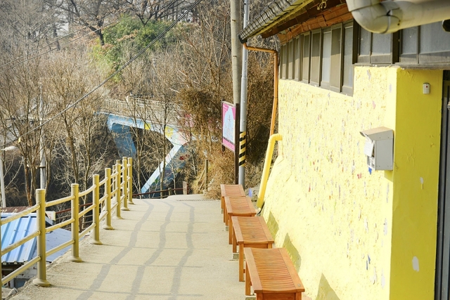 골목을 내려오며 작업할 당시 관광객들이 직접 참여하기도 했다는 한글길도 만나고 우모내모 달동네 옥상 쉼터도 올라보았습니다. 다 보여드리지 못한 곳들이 많습니다. 산동네 한쪽 끝에 서서 바라보면 동네 뒷산 절반 정도의 규모로 주택 40여 채가 있는 작은 마을이지만 벽화와 마을 이야기 사람 사는 따뜻한 이야기가 가득한 마을입니다.