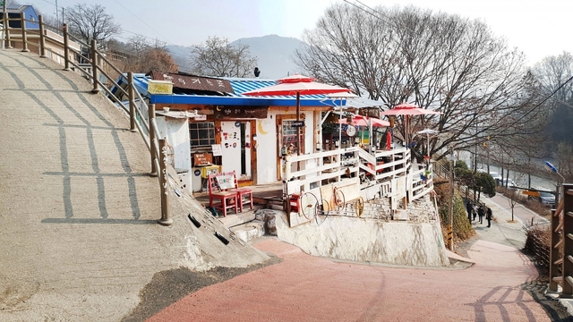 다리를 건너 오른쪽으로 가면 입구에 놀다 가는 곳이라는 카페가 알록달록 아기자기하게 꾸며져 있는데요. 이곳이 벽화마을의 시작임을 알 수 있습니다. 놀다 가고 싶지만, 출발지인지라 우선 마을 구경부터 하려고 언덕을 올라갑니다.