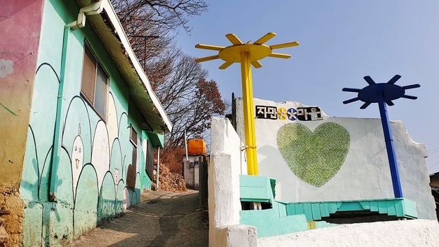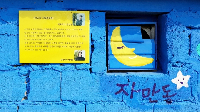 자만 벽화마을은 한국전쟁 때 피난민들이 정착하면서 형성된 달동네입니다. 세월이 흘러 사람들이 하나둘 산동네를 떠나자 비어가는 골목에 숨길을 불어넣고자 주민들과 동사무소 그리고 지역 작가들이 힘을 모아 벽화 골목을 조성하게 되었습니다. 무더위와 모기의 습격을 이겨내며 다 같이 청소하고 다 같이 페인트칠하고 웃으며 몇 달을 보낸 결과물이라고 했습니다.