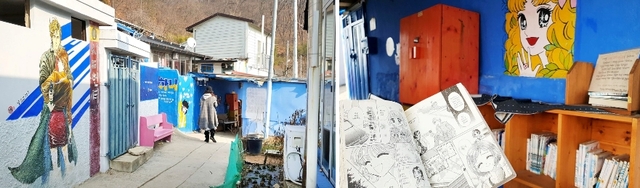 만화 벽화가 그려진 골목에는 주민들이 쌈짓돈을 모아 준비한 추억의 만화책도 있었습니다. 마을 입구 안내판에도 이곳 만화벽화가 그려진 곳에도 자만동 주민들의 당부 글이 있었습니다. "자만 달동네 깔끄막까지 올라오신 걸 환영합니다~"라는 환영 인사와 함께 벽화에 낙서하지 말아 달라는 당부, 자만 달동네에 수년째 숨길을 불어 넣어 주고 있는 마을 가게를 이용해 달라는 당부의 글도요. ‘깔끄막’이 무슨 뜻인지 궁금해 검색해보니 비탈길 언덕을 이르는 전라도 방언이었습니다.