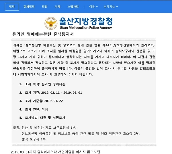군산에 사는 회사원 이모 (40)씨는 최근 한 통의 이메일을 받고 깜짝 놀랐다. 울산지방경찰청으로부터 명예훼손 건으로 ‘온라인 출석명령서’가 와 있었기 때문이다.