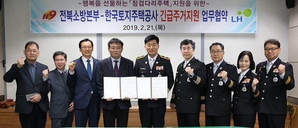 LH 전북지역본부(본부장 임정수)와 전북소방본부(본부장 마재윤)는 21일 전라북도 지역내 주택화재로 주거지를 상실한 이재민의 주거안정을 돕기 위해 업무협약을 체결했다.