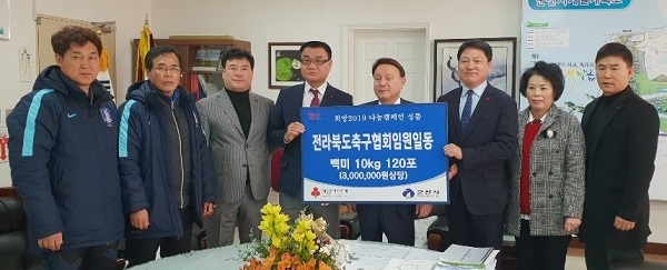 전라북도축구협회 임원진은 21일 어려운 이웃을 돕기 위한 사랑의 쌀(10㎏) 120포(300만 원 상당)를 군산시에 기탁했다.