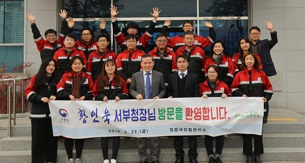황인욱 서부지방산림청장이 지난22일 정읍국유림관리소를 방문해 주요 업무보고를 받고 직원들과 간담회를 가졌다.