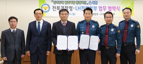 LH 전북지역본부(본부장 임정수)와 전북지방경찰청(청장 강인철)은 25일 LH 임대주택단지 범죄예방 환경 조성 등을 위한 업무협약을 체결했다.
