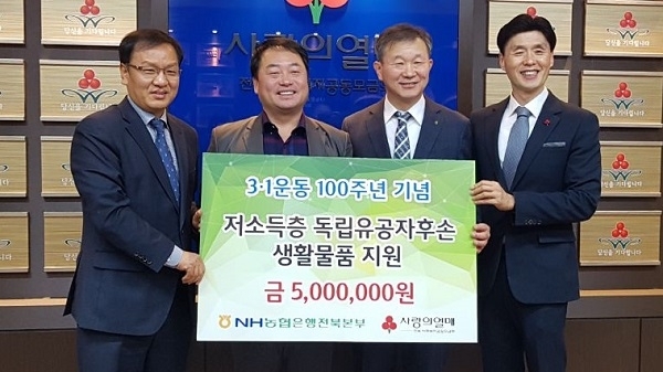 NH농협은행 전북본부(본부장 김장근)는 3·1운동 및 임시정부수립 100주년을 맞아 전북지역 저소득층 독립유공자 배우자와 후손 10가구를 방문해 감사의 말과 500만원 상당의 생활물품을 전달했다고 26일 밝혔다.