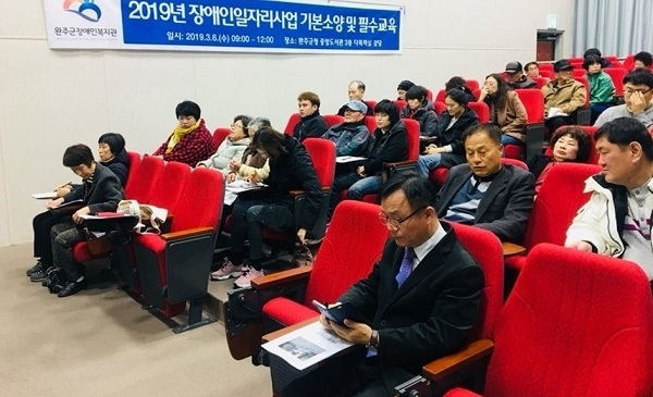 완주군은 6일 중앙도서관에서 ‘2019년 장애인 일자리사업’ 56명의 참여자를 대상으로 일자리사업 안내 지침과 함께 직무 및 소양교육을 실시했다.