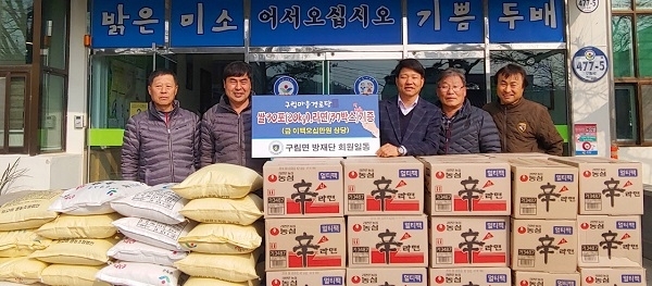 순창군 구림면자율방재단(회장 전종철)은 지난 7일 구림면 경로당에 쌀 30포(20kg)와 라면 37박스(250만원 상당)를 기탁했다.