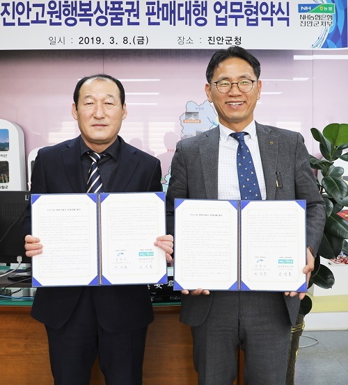 이날 최성용 군수권한대행과 김성훈 NH농협진안군지부장은 군과 농협을 각각 대표해 업무협약서에 서명했다. 협약에 따라 군지부를 비롯 진안·부귀·백운 농협은 지역화폐인 진안고원행복상품권 판매를 대행한다. 관내 소재 전북인삼농협과 무진장축협도 대행 업무에 동참한다. 이로써 진안고원상품권은 읍면지점을 포함 관내 15개 점포에서 구입 또는 환전 가능하게 됐다.