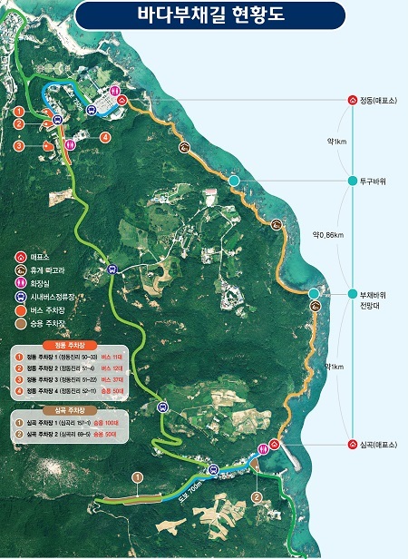 바다부채길을 관리하는 강릉관광개발공사는 최근 새로운 볼거리와 포토존을 만들기 위해 인공바다폭포도 만들고 전망대도 조성했다. 몰려드는 관광객들의 편의를 위해 버스 60대가 들어설 수 있는 대형 주차장도 추가로 조성중이다. 바다의 해안단구를 이어 만든 길이 정동진과 심곡, 옥계를 잇는 강릉의 새로운 관광루트를 만들고있다.