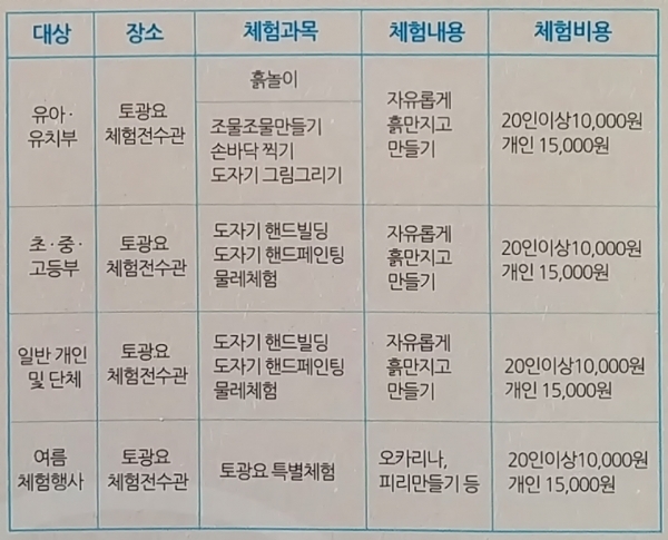 ◆체험 과목 재료비, 소성비 포함 가격입니다.