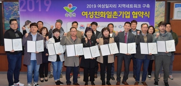 19일 군에 따르면 군청 영상회의실에서 여성 근로자들의 근로환경 개선을 위해 관내 기업들과 여성친화일촌기업 협약식을 가졌다.