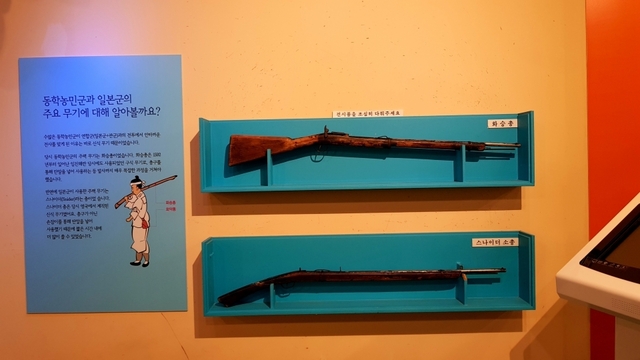 어린이를 위한 전시관이라고 해서 절대 허술하지 않습니다! 당시 농민군이 사용했던 구식 무기인 화승총과 일본군이 사용하였던 신식 무기인 스나이더 소총의 실물모형을 전시하여 당시 농민군과 일본군의 화력의 차이가 컸음을 비교할 수 있도록 해두었습니다.