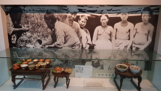 이 전시관에서 가장 가슴 아팠던 것은 바로 이 밥상이었습니다. 산해진미가 가득한 양반가의 밥상에 비해 열악한 환경 속에서 누구보다 피땀 흘려 일한 농민은 풍족하기는커녕 밥과 국, 김치가 전부인 초라한 밥상이었습니다.