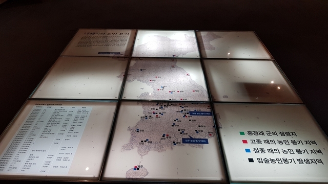본격적인 전시는 기념관 2층에서 시작되는데요. 2층 전시관 입구에 들어서면 가장 먼저 커다란 한반도 지도가 반겨줍니다. 이 지도에는 조선시대 발생하였던 농민봉기들의 점령지를 보여주고 있는데요.