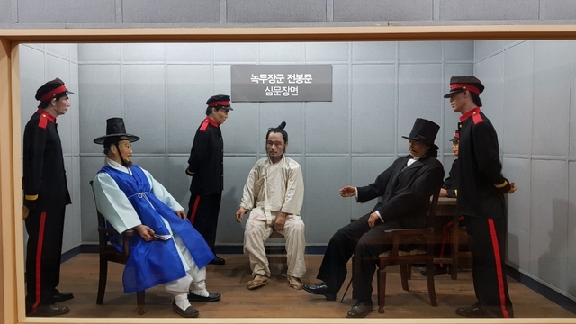 천하를 울리던 농민군은 우금치 전투에서 대패하며 사실상 동력을 상실하고 총사령관이었던 녹두장군 전봉준이 체포되며 그 세력이 약화하고 결국 와해하고 말았습니다. 당시 전봉준을 심문하던 모습이 밀랍인형으로 전시되어 있었습니다.
