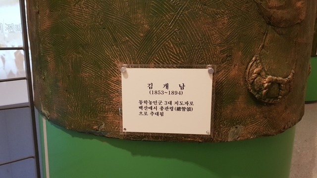 2층 전시관에서 다시 1층으로 내려오는 도중에 문득 기둥들이 특이해서 자세히 보게 되었는데요. 기념관의 기둥들에는 모두 동학농민운동의 주체이었던 6인을 형상화한 조각이 붙어있었습니다. 이런 섬세한 부분까지 신경 쓴 것이 정말 감동적으로 와 닿았습니다.