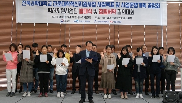 전북과학대학교(총장 황인창)는 지난 22일부터 23일까지 익산 웨스턴라이프호텔 선화홀에서 ‘전문대학 혁신지원사업 공청회와 혁신지원사업단 발대식 및 청렴서약 결의대회’를 개최했다.
