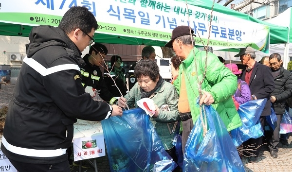 26일 무주군청 분수대에서 진행된 행사에서는 1500여 명의 주민들에게 유실수, 야생화, 초화류, 조경수 등 13개 수종 5250 그루의 나무가 분양됐다.