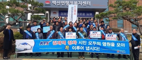 KTX 김제역 정차에 대한 시민들의 관심이 높아지고 있는 가운데 김제시 백산면(면장 황경)이 26일 ‘KTX 김제역 정차를 위한 캠페인’을 가졌다.