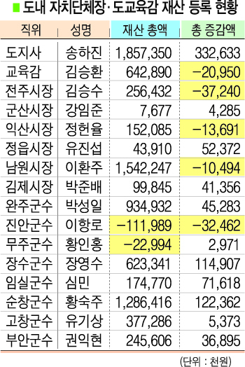 전북지역에서 재산이 제일 많은 자치단체장은 송하진 도지사이며, 지난 1년 동안 재산증감액도 가장 높은 것으로 나타났다.