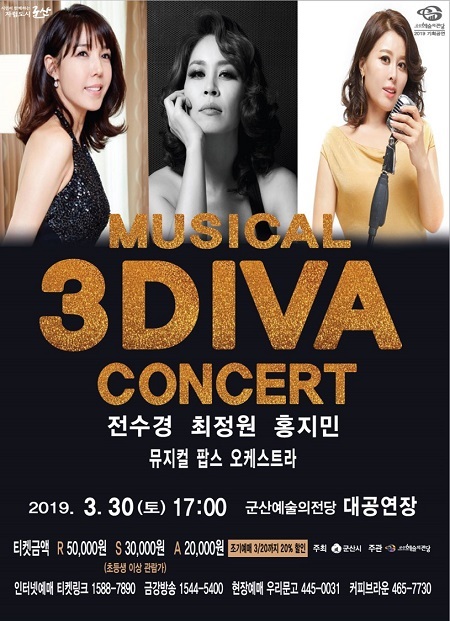 군산예술의전당이 봄을 맞아 준비한 기획공연 ‘뮤지컬 3DIVA 콘서트’가 오는 30일 오후 5시 예술의전당에서 열린다.