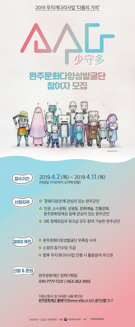 문화재단 관계자는 “‘소수다(少守多)’는 올해 2년차인 무지개다리사업을 완주문화재단과 함께 운영할 주체”라며 “문화체육관광부와 한국문화예술위원회가 후원하는 무지개다리사업은 문화다양성 증진 및 확산을 위하여 사회 전반의 문화다양성 공감대 형성 및 인식 수용성 제고에 목적을 두고 있다”고 말했다.